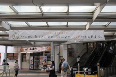 「人に優しい、新型コロナ対策市長メッセージ―いっしょにのりこえよう。―」の発信に伴って、令和2年8月28日、JR北朝霞駅東口と東武東上線朝霞台駅北口を結ぶ連絡通路に、その想いを込めたメッセージを横断幕に乗せて設置しました。