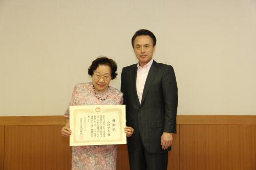 ロンドンオリンピックに出場する土井杏南選手の祖母である土井かよ子さんに杏南選手への応援旗を渡しました。