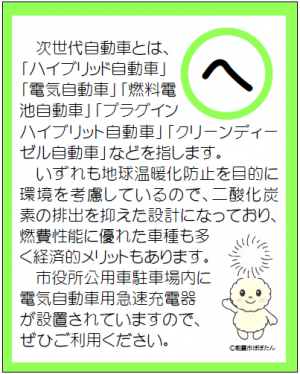 減らそう 二酸化炭素 次世代自動車で [PDFファイル/304KB] ↑クリックするとPDFファイルで大きくなります |
