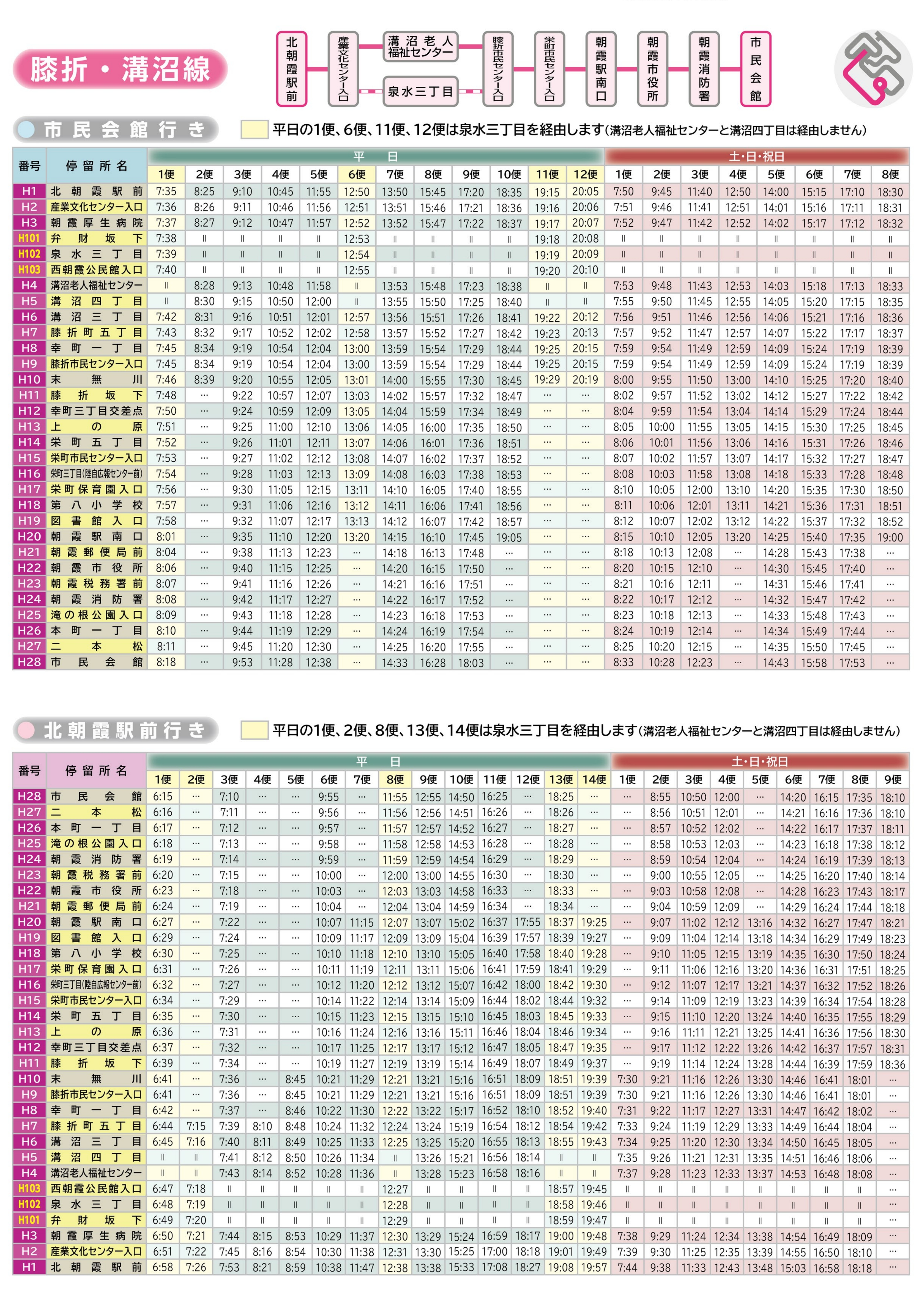 市民会館⇔北朝霞駅前 市民会館(ゆめぱれす)、朝霞消防署、朝霞税務署、朝霞市役所、朝霞郵便局、朝霞駅、図書館(本館・別館)、陸上自衛隊広報センター、溝沼老人福祉センター、朝霞厚生病院、産業文化センター、リサイクルプラザ、西朝霞公民館、朝霞台駅・北朝霞駅 小・中学校(第八小、第三中、第四中)、市民センター(栄町、膝折、溝沼)、児童館(ひざおり、みぞぬま) |