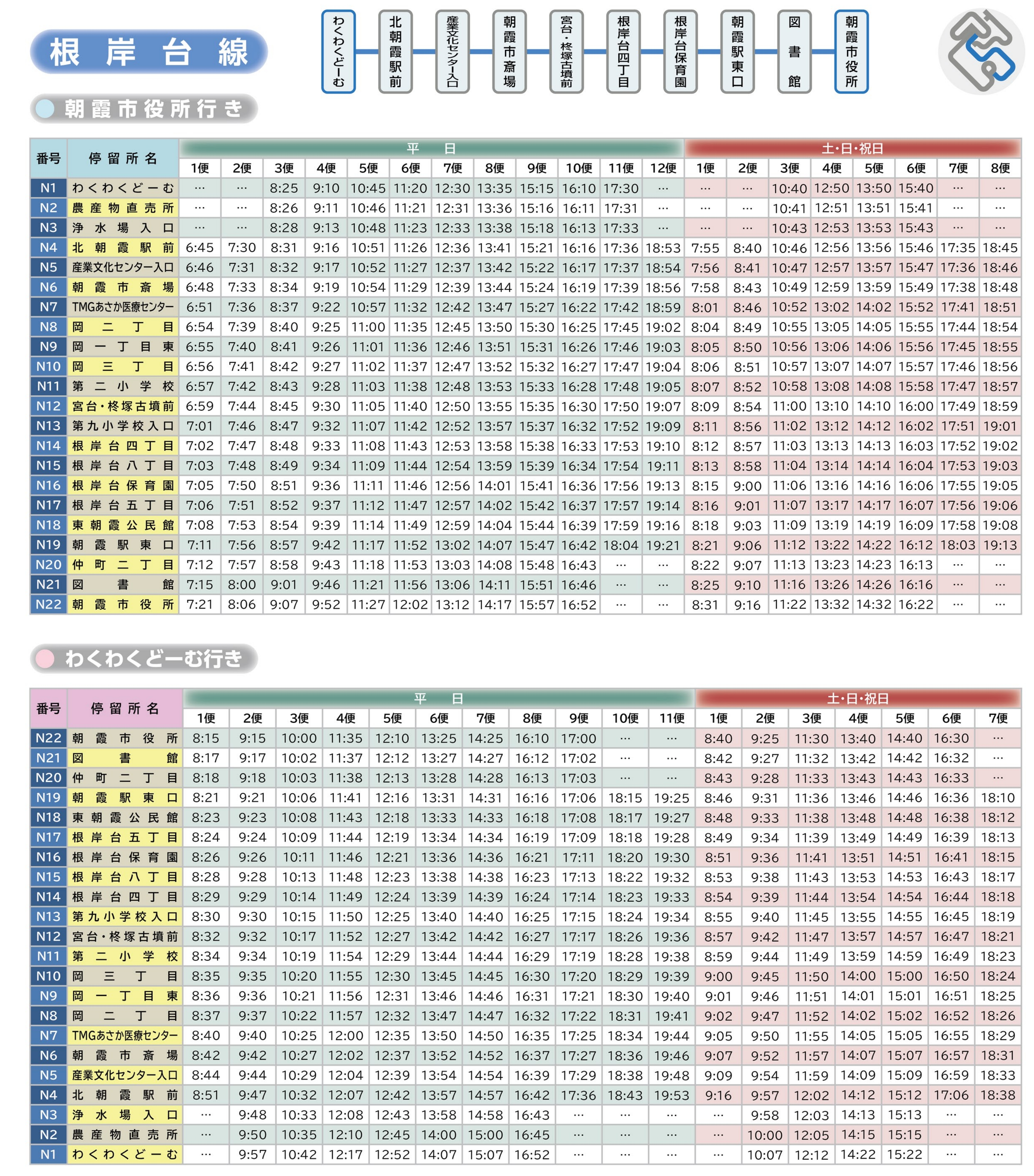 朝霞市役所⇔わくわくどーむ 朝霞市役所、図書館(本館・別館)、朝霞駅、東朝霞公民館、くみまちモールあさか、旧高橋家住宅、TMGあさか医療センター、斎場、産業文化センター、リサイクルプラザ、朝霞台駅・北朝霞駅、農産物直売所、わくわくどーむ(健康増進センター)、はあとぴあ(総合福祉センター)、浜崎老人福祉センター 小・中学校(第九小、第二小)、市民センター(根岸台)、児童館(ねぎしだい、はまさき) |