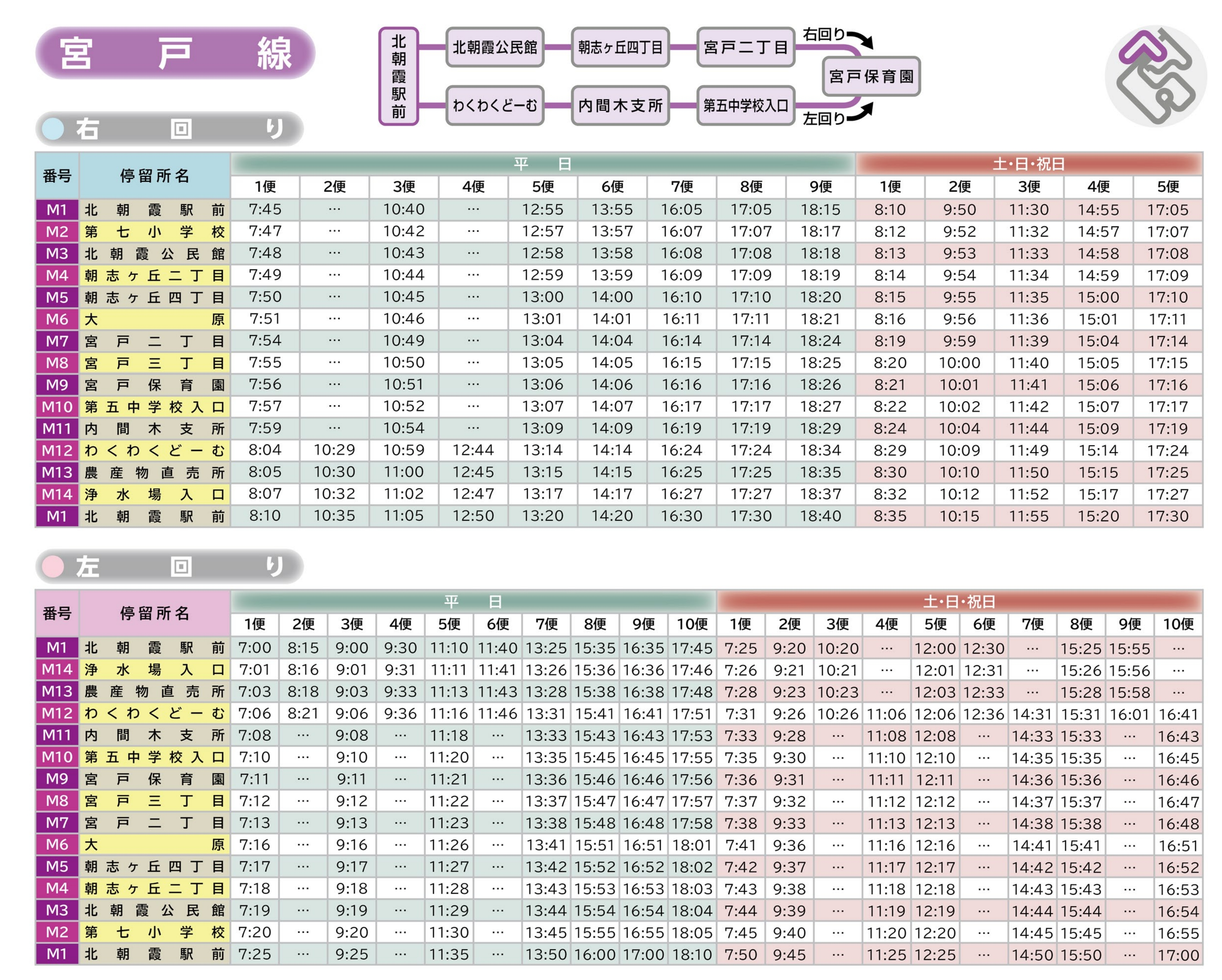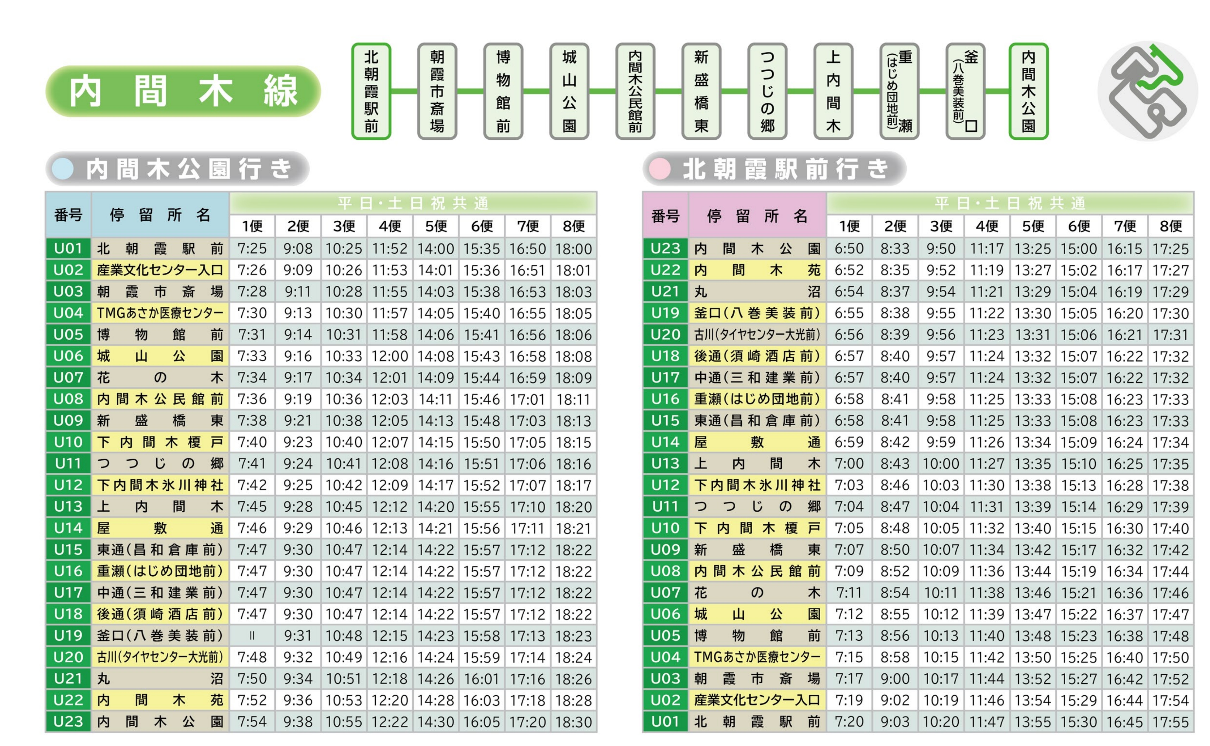 北朝霞駅前発着(循環路線:右回り、左回り) 朝霞台駅・北朝霞駅、農産物直売所、わくわくどーむ(健康増進センター)、はあとぴあ(総合福祉センター)、浜崎老人福祉センター、内間木支所、北朝霞公民館 小・中学校(第三小、第七小、第五中) |