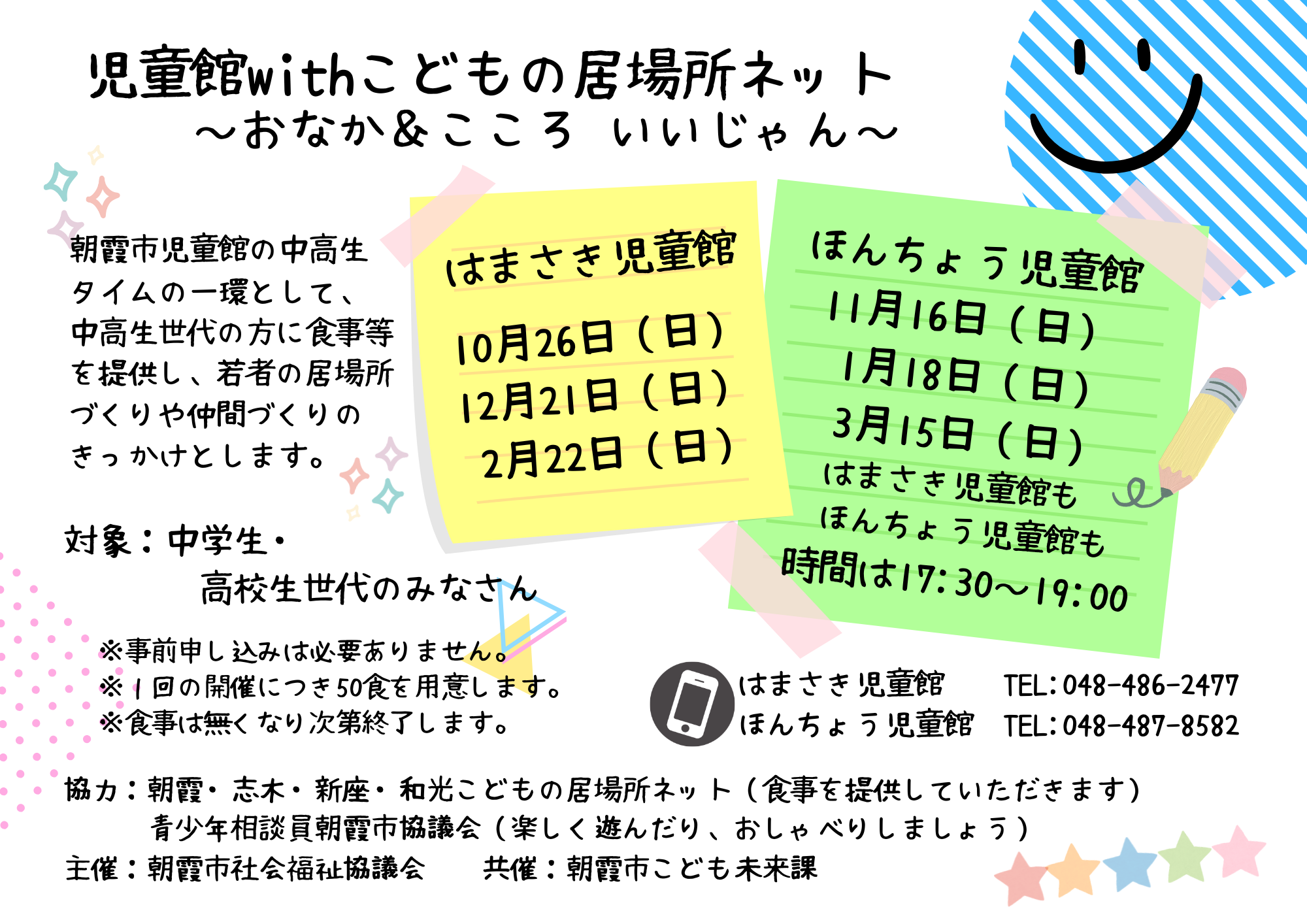 【記者発表資料】朝霞市は中高生世代のおなかとこころを応援します!朝霞市児童館中高生タイム 児童館withこどもの居場所ネット ~おなか&こころ いいじゃん~